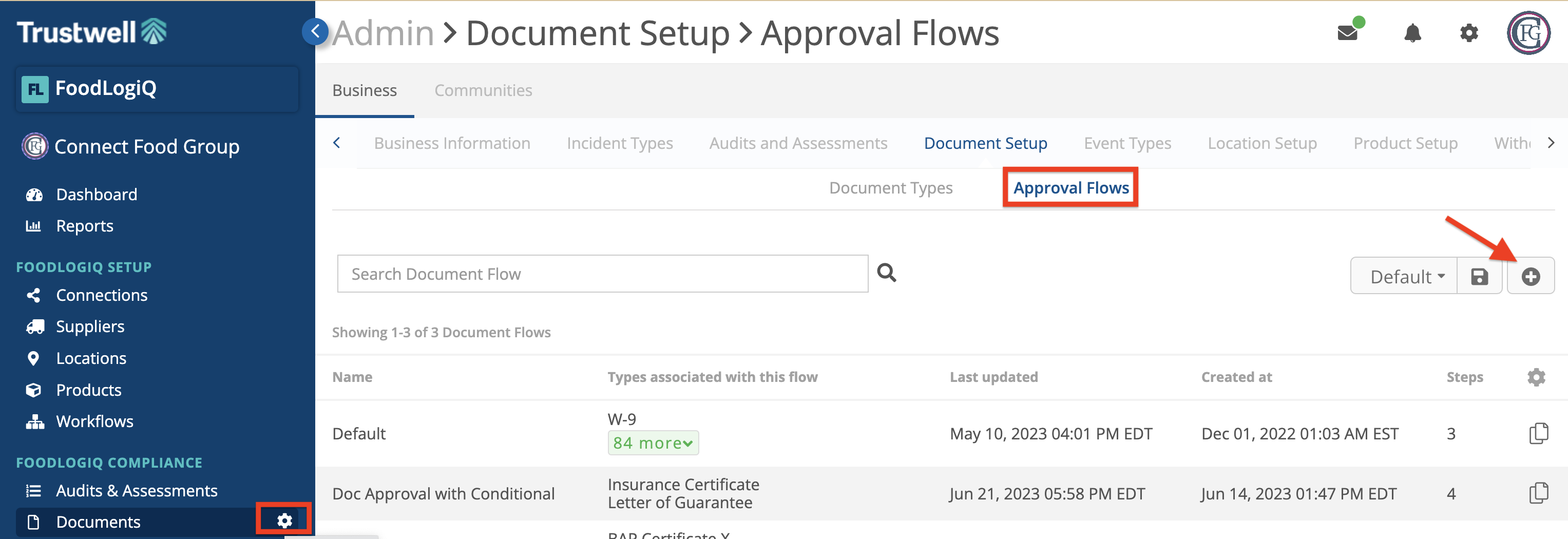 1. Navigate to your Document Setup page by clicking the cog wheel next to documents. Then, select the Approval Flows tab and click the "+" button to configure a new flow.