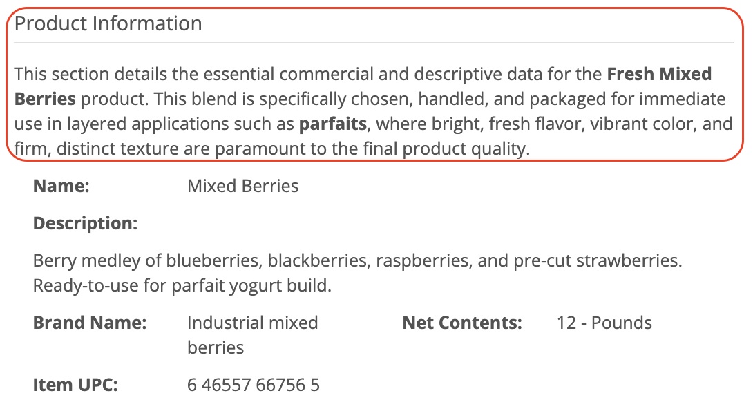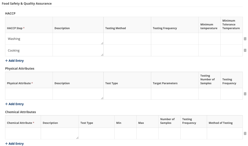 When the template is used to create a Specification, attributes related to Food Safety & Quality Assurance will appear formatted as tables in the resulting Specification. These attributes will be grouped by type (critical control points, physical attributes, chemical attributes, microbiological details, and defects) and separated into stand-alone tables allowing for multiple entries in each of these areas.