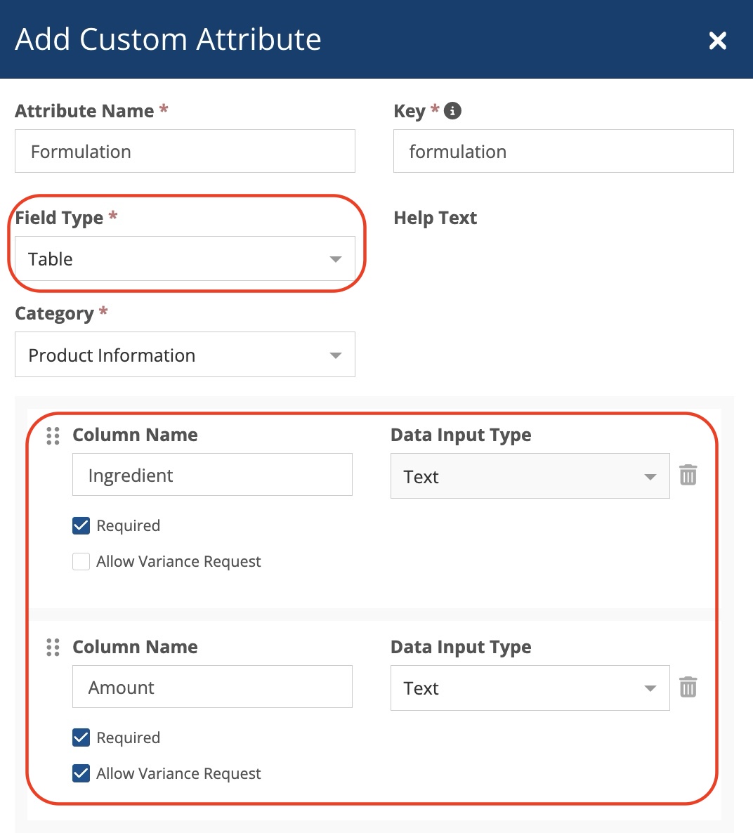 You can add up to 7 columns for each table by clicking “Add Column,” specifying the data type (Text, Whole Number, Yes/No), and indicating with a check box whether the information is required or allows for a Variance Request. Columns can be dragged and dropped into the desired order. The first column is required to be a text field.