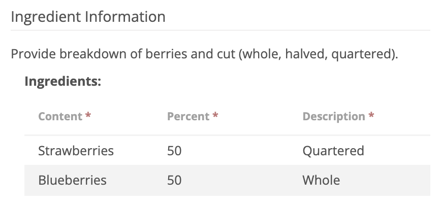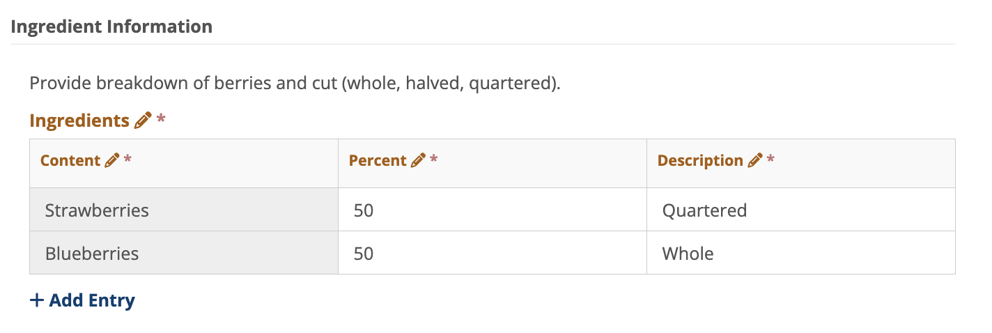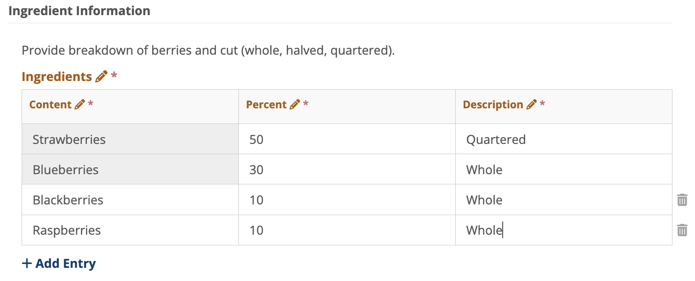 View after Selecting Add Entry and Editing Table: You cannot change Strawberries or Blueberries as they are shaded and required. You can add additional entries and change percentages or descriptions. You can use trash can to delete a row or add entry to add a row.