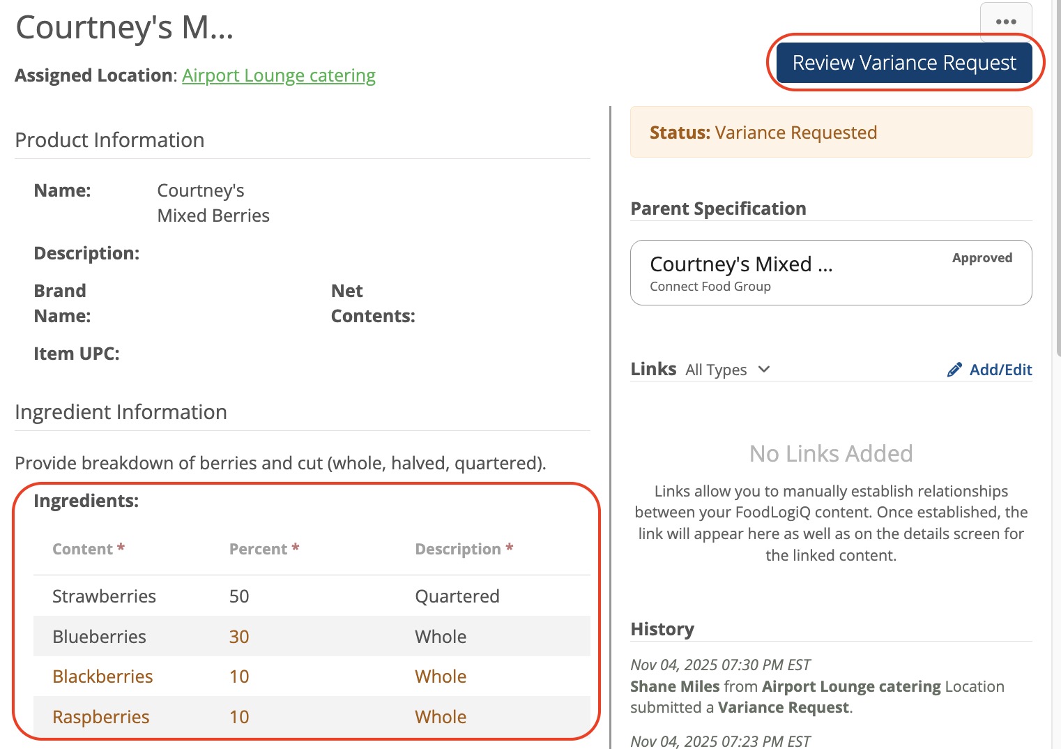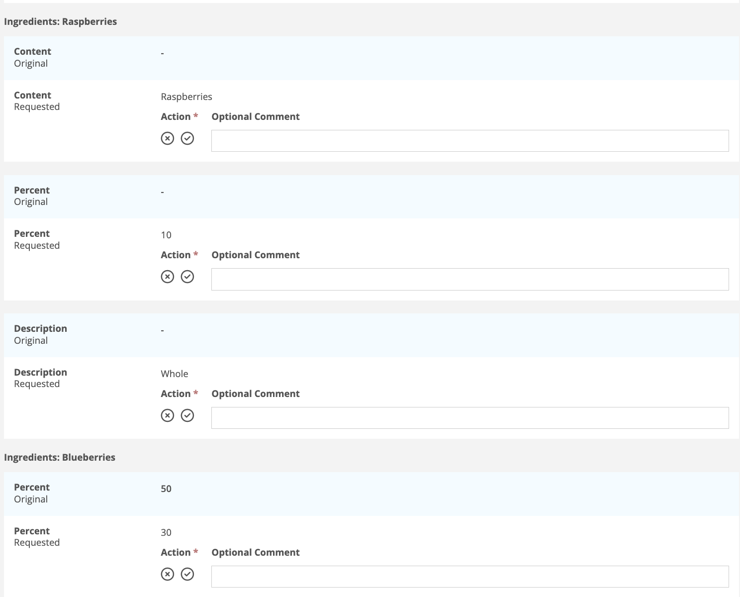 When you review variances in tables, you will review each cell of the table separately. In the example below, you will accept or reject Raspberries (content), 10 (percent), and Whole (description) individually. For blueberries, you only accept or reject the change in percentage. Raspberries are a variance requested row so there is no original with which to compare. Blueberries show the original 50 percent and requested variance of 30 percent.