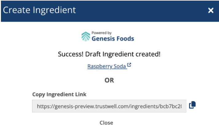 - Integrated with Genesis Foods so that a Community Owner can create an Ingredient in Genesis Foods from a specification in FoodLogiQ. While the Ingredient remains in a draft version 1 state in Genesis Foods, the systems will sync any changes every 10 minutes.