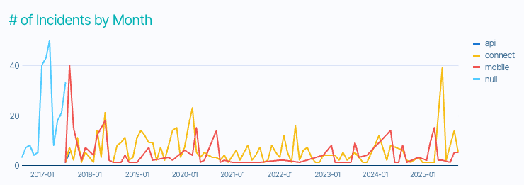 Let's say, for instance, we want to compare over time how the incidents were added to the FoodLogiQ platform utilizing the Create Source attribute. We will build a standard graph (Created on the X-Axis, ID of the incident on the Y-Axis), and then use the Color capability to group by an attribute.