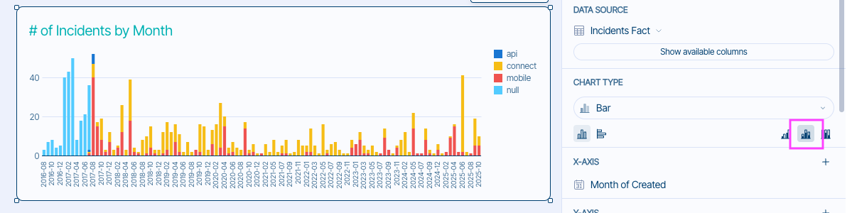 To start, we'll use the Incidents Fact as our data source, which will make the incidents columns available from our graph.