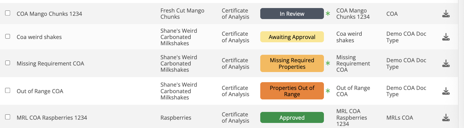 - Added a new Document Type – Certificate of Analysis (COA) – with several additional default attributes including purchase order, reference document number, lot/batch, and a COA table that allows users to track product properties and their acceptable values in a specified unit of measure.