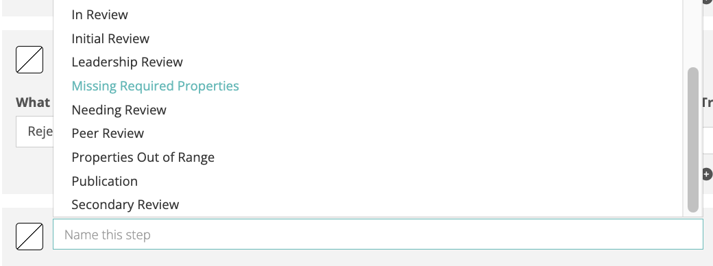 Awaiting Approval, Approved and Rejected are automatically populated. For these COA Document transitions, you will need to add a step for Missing Required Properties and Properties out of Range by selecting those steps from the drop-down menu. -