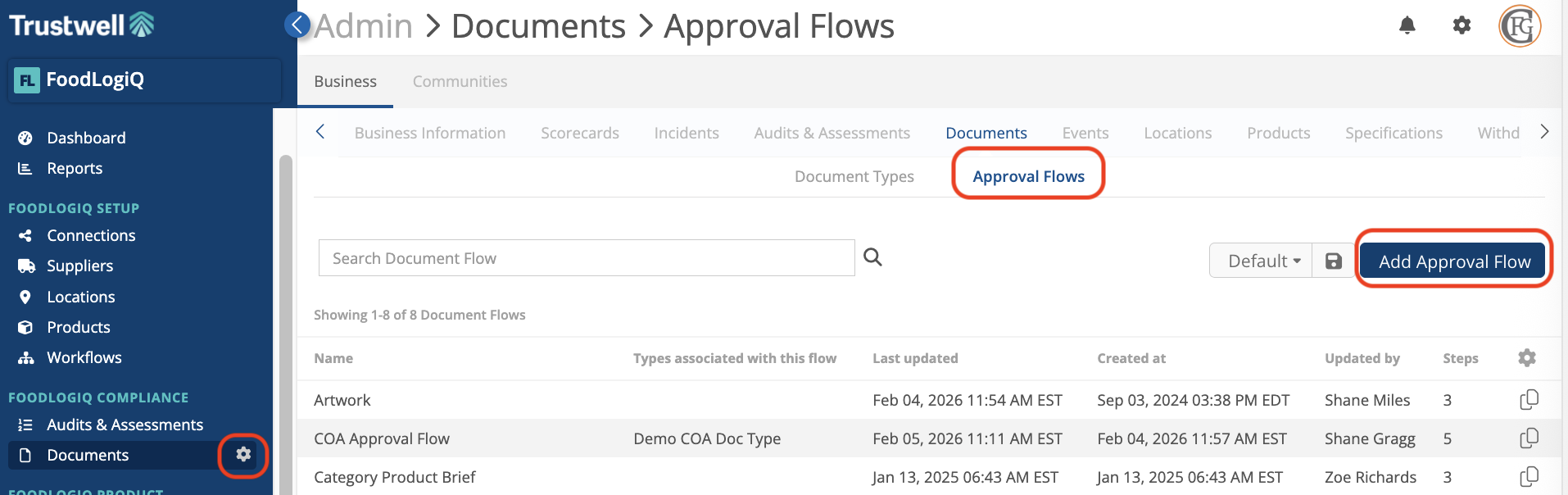 Navigate to your Document Setup page by clicking on the cog wheel next to Documents. Then, select the Approval Flows tab and click the "+" button to configure a new flow.