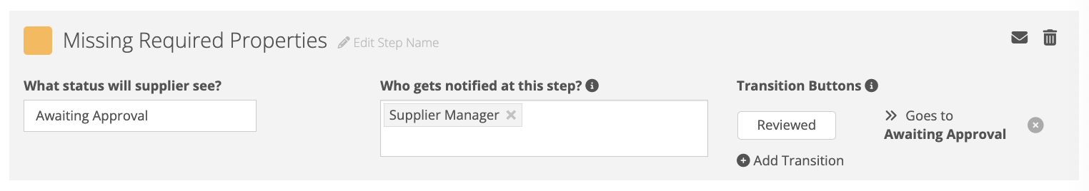 Customize each step with a color, what status the supplier will see, who gets notified at this step, and add transition buttons as needed to determine where the document will go next.